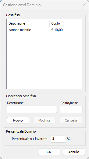 - Nuovo: compilare i campi Descrizione e Costo/mese e premere questo pulsante per inserire un nuovo costo fisso.