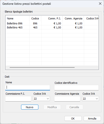 Con questa funzione è possibile gestire i listini prezzi utilizzati per i bollettini postali.