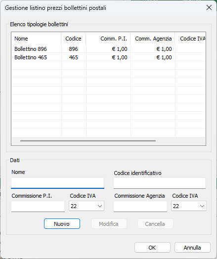 - Nuovo: permette di creare un nuovo tipo di bollettino postale.