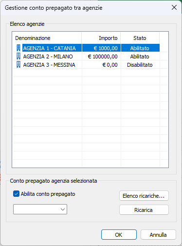 Selezionando una agenzia si abiliteranno i controlli nella sezione Conto prepagato agenzia selezionata.