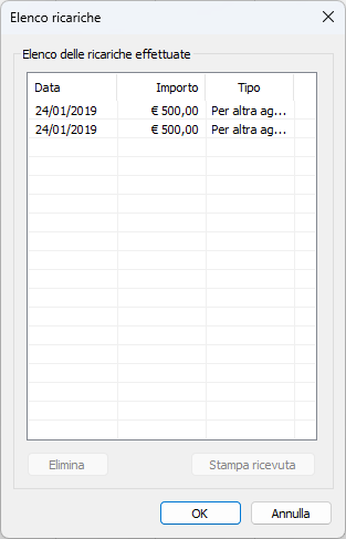 - Ricarica: selezionare un importo o inserirne uno da tastiera nel menu a discesa accanto e premere questo tasto per effettuare una ricarica per l'agenzia selezionata.
