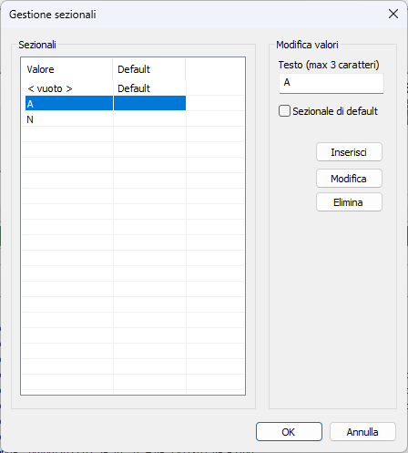 - Sezionali: in questa lista sono visibili tutti i sezionali presenti nel sistema. E' sempre presente un sezionale <vuoto> che indica l'assenza di un sezionale specifico. Questa voce serve ad impostare come quello predefinito il sezionale vuoto. La voce non è modificabile. Selezionando una voce nella lista il relativo valore apparirà nella sezione acconto Modifica valori.