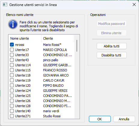 Mettendo una spunta accanto al nome utente è possibile abilitare un account. Togliendo la spunta quell'account non potrà più accede all'area clienti web.