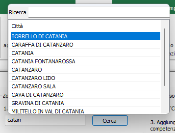 Inserire nel campo di testo una località da cercare e premere il pulsante Cerca. Nel caso vi fosse più di una località che corrisponde al testo inserito apparirà un elenco come quello sotto riportato. Fare doppio click da questo elenco sulla località cercata, oppure selezionarla e premere INVIO. Nel campo Ricerca dell'elenco è possibile affinare ulteriormente la ricerca prima della selezione.