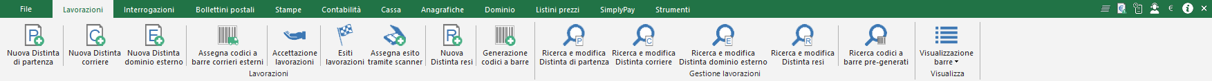 Barra multifunzione Lavorazioni In questa sezione sono racchiuse tutte le funzionalità che hanno a che vedere con le fasi di avanzamento delle lavorazioni. Sono presenti anche le ricerche delle varie Distinte prodotte da PostOfficeManager.