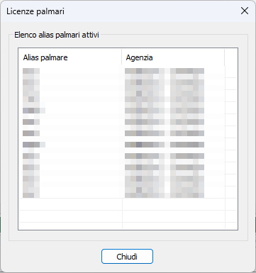 Nell'elenco sono visualizzati tutti gli alias e l'agenzia ad essi collegata. Gli utenti di tipo Amministratore Dominio visualizzeranno le licenze attive di tutte le agenzie, mentre gli altri utenti solo quelle dell'agenzia in cui sono connessi.