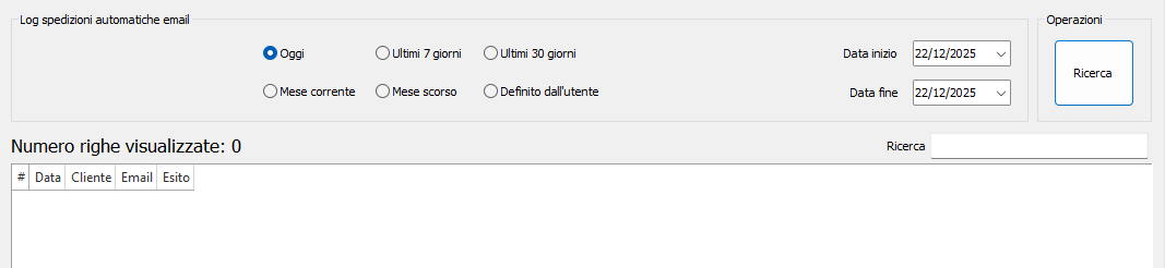 In questa griglia verranno visualizzati i dettagli delle email spedite o l'eventuale errore riportato in caso di mancato invio, quale ad esempio indirizzo email del cliente non corretto o altro.