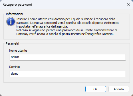E' necessario inserire il nome utente per cui si desidera recuperare la password ed il dominio. La procedura automatica invierà una nuova password per il Nome utente inserito all'indirizzo email presente in anagrafica agenzia.