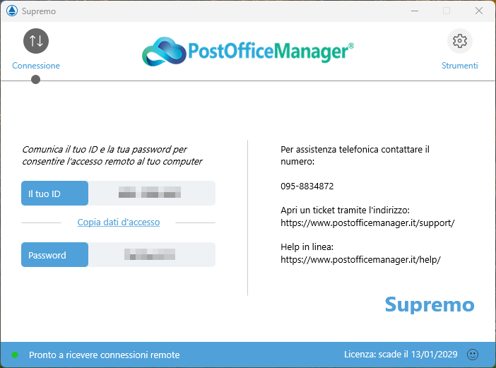 Quando richiesto dall'assistenza comunicare l'ID e la password riportati nella finestra per permettere l'accesso da remoto sul proprio PC per finalità di assistenza tecnica.