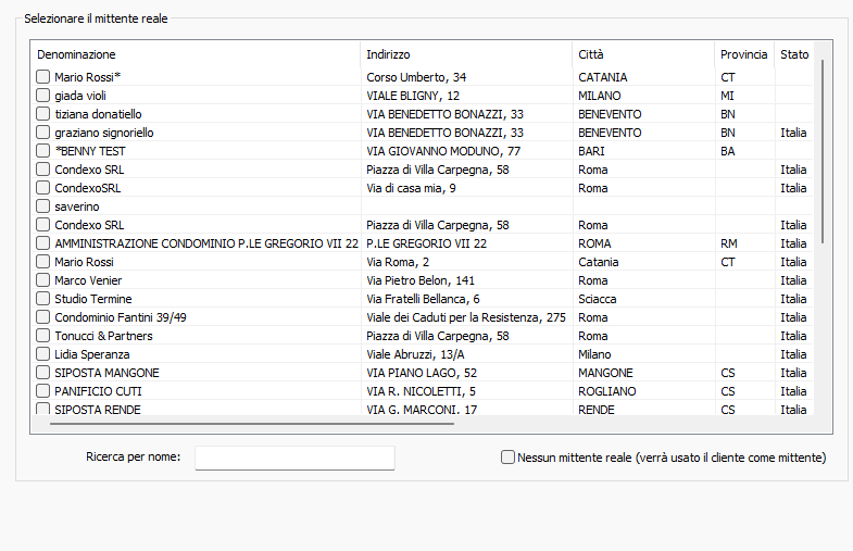 - Nessun mittente reale (verrà usato il cliente come mittente): togliere la spunta da questa voce se si desidera impostare un mittente reale diverso dall'anagrafica corrente. Si attiveranno la lista delle anagrafiche ed il campo di ricerca.
