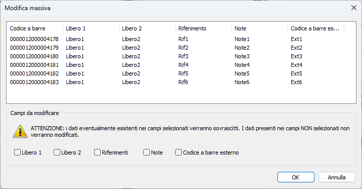 Nella parte bassa selezionare i campi delle lavorazioni che si desidera modificare. Se il campo selezionato presentava altri dati questi verranno sovrascritti. I campi non selezionati non verranno modificati.
