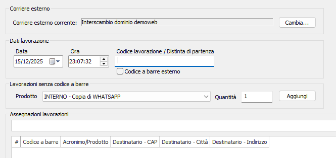 - Codice lavorazione / Distinta di partenza: in questo campo è possibile inserire il codice a barre della lavorazione da inserire. Se abilitato in Altre Distinte ed esiti nelle impostazioni, è possibile inserire un codice a barre di una Distinta di partenza per inserire massivamente tutte le lavorazioni da veicolare con il tipo di vettore selezionato.
