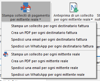 - Spedisci un WhatsApp per ogni mittente reale:permette di spedire via WhatsApp un sollecito di pagamento raggruppando le fatture non saldate per Mittente reale.