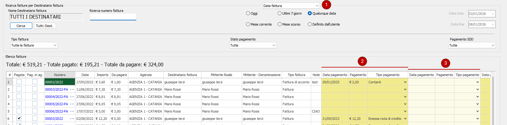 - Pagata: mettendo una spunta su una casella di questa colonna si inserirà un pagamento per l'intero importo della fattura alla data odierna.