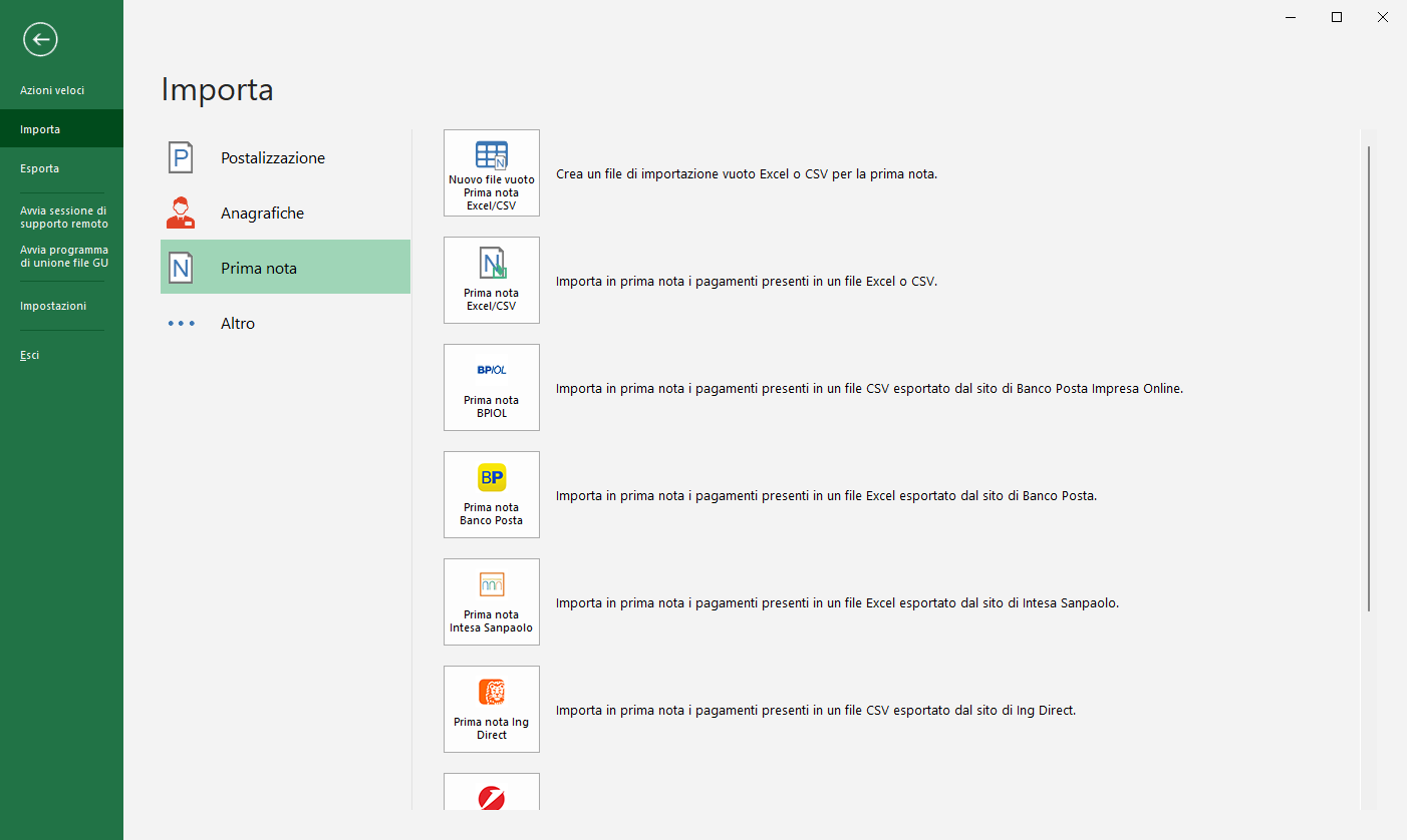 Barra multifunzioneFileImporta Prima nota Queste funzioni permettono di effettuare la riconciliazione bancaria delle fatture emesse. Sono supportati diversi formati dai più comuni istituti bancari.