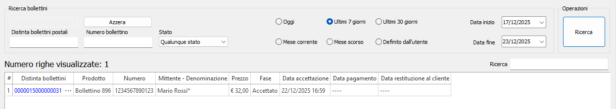 - Stato: selezionare lo stato nel quale devono essere i bollettini cercati, tra Accettato, Pagato, Restituito al cliente e Qualunque stato.