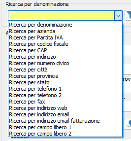 In alto nella finestra dell'anagrafica clienti è presente una sezione dove è possibile eseguire ricerche sulle anagrafiche stesse. Dalla stessa area è possibile applicare dei filtri per visualizzare solo alcune anagrafiche.