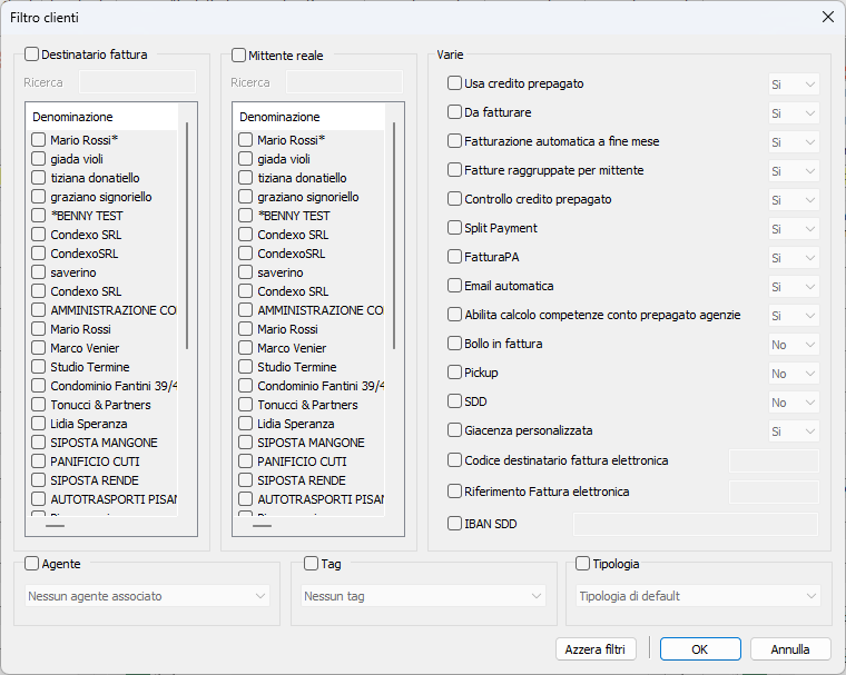 è possibile filtrare le anagrafiche in base a diversi parametri. Apparirà una finestra come quella qui sotto riportata: