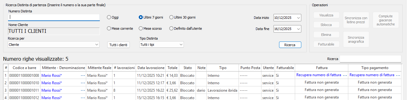 - Tipo Distinta: permette di filtrare le Distinte tra quelle normali, ibride, ibride pacchi, ibride telegrammi e CAD e CAN.