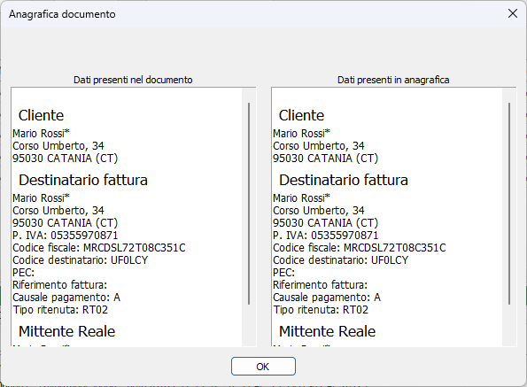 In questa finestra è possibile verificare se ci sono differenze tra le anagrafiche salvate nella Distinta e quelle presenti in Anagrafica clienti. Se dovessero esserci differenze queste saranno evidenziate in rosso.