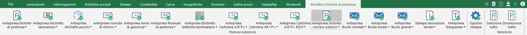 Premendo questo pulsante si apriranno le Anteprima di stampa di tutte le cartoline A/R di Poste Italiane delle lavorazioni presenti nelle Distinte di partenza selezionate. Verrà usato il formato M23I. Si veda Nuova Distinta di partenza nella sezione Barra Stampa documenti per maggiori dettagli.