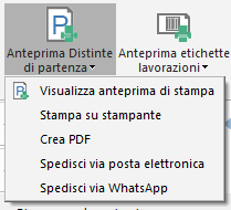 Premendo questo pulsante si apriranno le Anteprima di stampa di tutte le Distinte corriere esterno delle lavorazioni presenti nelle Distinte di partenza selezionate. Si veda Nuova Distinta di partenza nella sezione Barra Stampa documenti per maggiori dettagli.