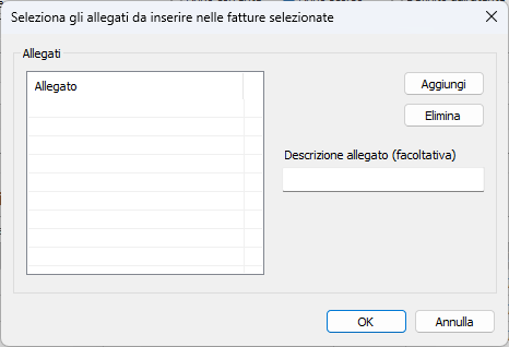 - Descrizione allegato: permette di inserire un testo descrittivo per l'allegato selezionato nella lista. Selezionare di volta in volta un allegato ed inserire il testo voluto. Il campo più essere lasciato vuoto. In questo caso il destinatario della fattura vedrà solo il nome del file.