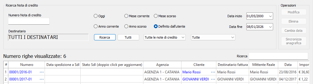 Nella griglia sono elencate tutte le note di credito trovate nel sistema in base ai parametri di ricerca immessi.