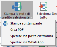 Il pulsante permette di mandare in stampa senza anteprima le note di credito selezionate nella griglia. Facendo click sulla parte bassa del pulsante stesso si aprirà un sottomenu che permette di generare i PDf delle note di credito, spedirle per email o per messaggio WhatsApp.