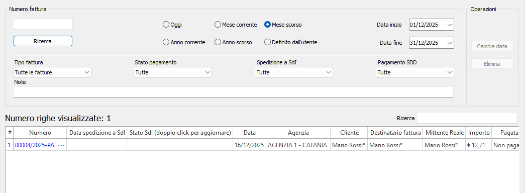 Nella griglia sono elencate tutte le fatture trovate nel sistema in base ai parametri di ricerca immessi.
