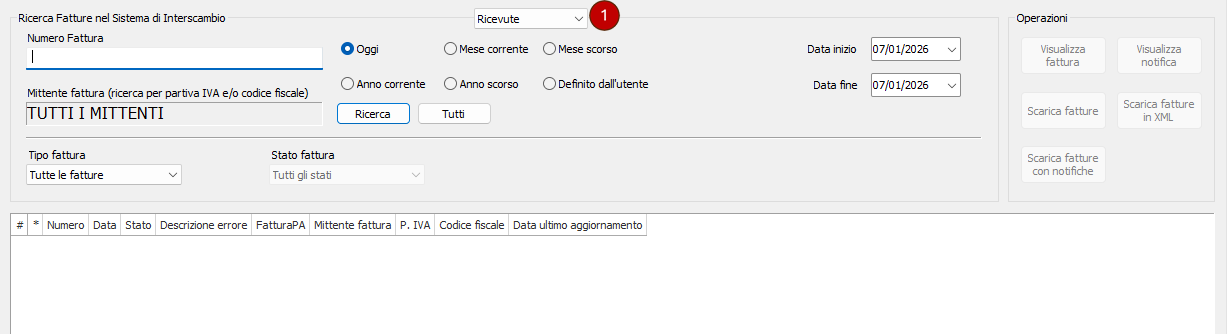 - Selettori date: selezionare l'intervallo temporale delle fatture da cercare.