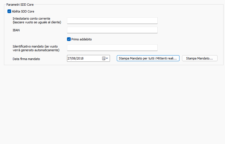 - Primo addebito: se si attiva un nuovo SDD Core per il cliente mettere il segno di spunta. Dopo la generazione del primo SDD verrà tolto in automatico dal sistema.