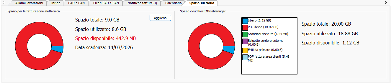 In questa sezione è possibile controllare lo spazio disponibile e totale attivo sul servizio di fatturazione elettronica di Aruba. I dati non sono aggiornati in tempo reale per motivi di velocità, ma è sempre possibile premere il pulsante Aggiorna per rinfrescarli.