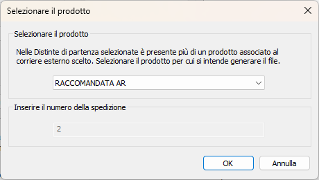 Permette di generare dei file Excel secondo lo standard accettato da Poste Italiane. Se nelle Distinte di partenza selezionate sono presenti più di un prodotto per il corriere selezionato apparirà una finestra come quella qui sotto riportata.