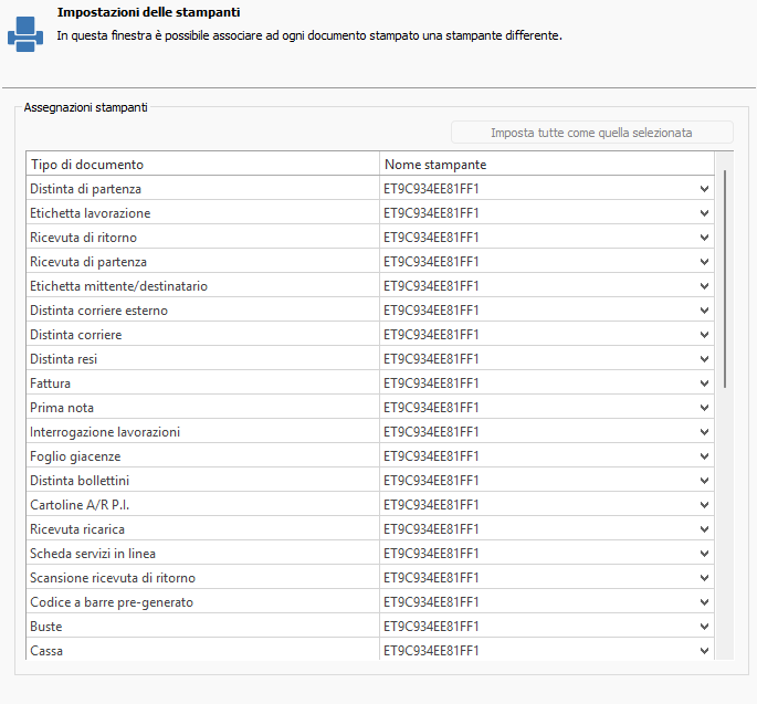 Premendo il tasto Imposta tutte come quella selezionata, il programma associa la stampante correntemente selezionata per tutti i tipi di documento.