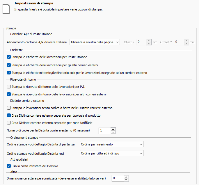 - Dimensione carattere personalizzata (impostazione globale): permette di specificare la dimensione del carattere usato nelle stampe. Deve essere abilitato lato server dall'assistenza tecnica.