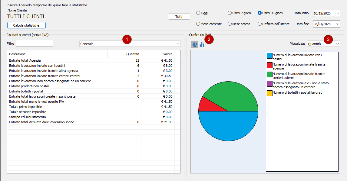 La finestra mostra le statistiche legate alle lavorazioni postalizzate nell'intervallo temporale specificato ed eventualmente per il cliente selezionato.