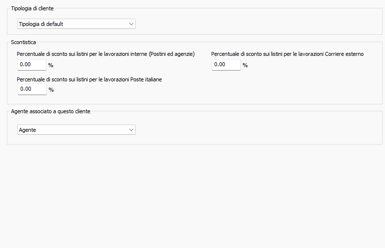 - Scontistica: inserire una percentuale di sconto da applicare. Sono previste 3 scontistiche separate a seconda della modalità di consegna utilizzata tra postino ed agenzie, corriere esterno oppure Poste Italiane.