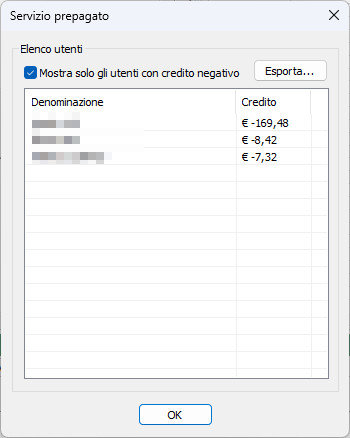 - Mostra solo gli utenti con credito negativo: se attiva vengono mostrati nella lista sottostante solo le anagrafiche il cui credito è negativo. Altrimenti vengono mostrate tutte le anagrafiche con servizio prepagato attivo.