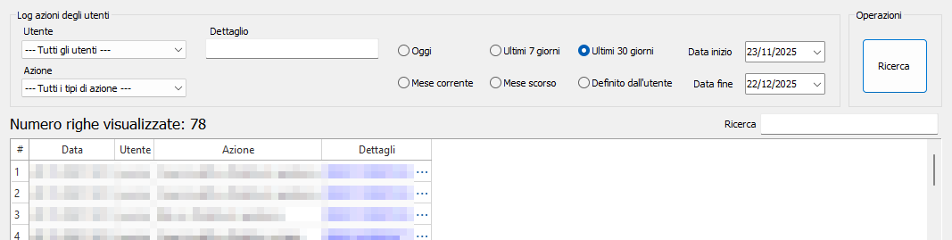 - Dettaglio: in questo campo inserire un testo che cambia in funzione dell'azione che si vuole cercare. Potrebbe essere il codice a barre di una Distinta di partenza, se si vuole sapere chi l'ha modificata o cancellata, il numero di una fattura, e tanto altro.