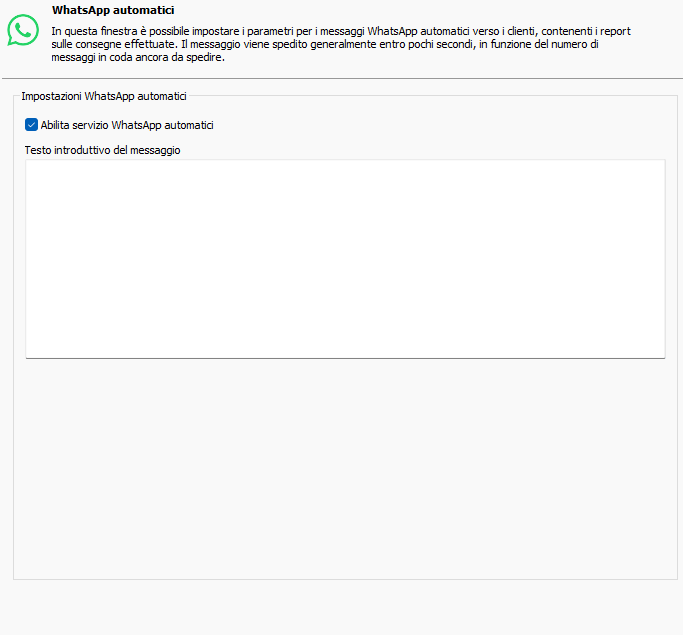 In questa finestra è possibile impostare i parametri per i WhatsApp automatici verso i clienti, contenenti i report sulle consegne effettuate. L'invio dei messaggi WhatsApp avverrà in tarda serata.